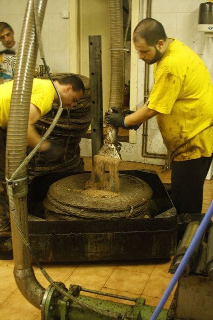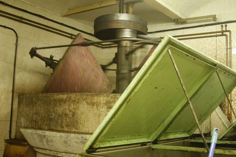 Las aceitunas se dejan caer en el molino de piedra, donde se trituran para obtener una pasta, mezcla de aceite, hueso y piel de la oliva.