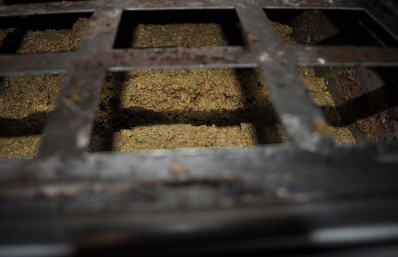 Dentro del molino, se trituran para hacer una pasta homogénea que pasa por las batidoras. Hay 6 individuales de 1000kg c/u para separar las partidas por clientes. Esta pasta se mantiene a una temperatura inferior a los 27ºC (extracción en frio) y, de esta manera, se reduce la volatilización de los aromas.
